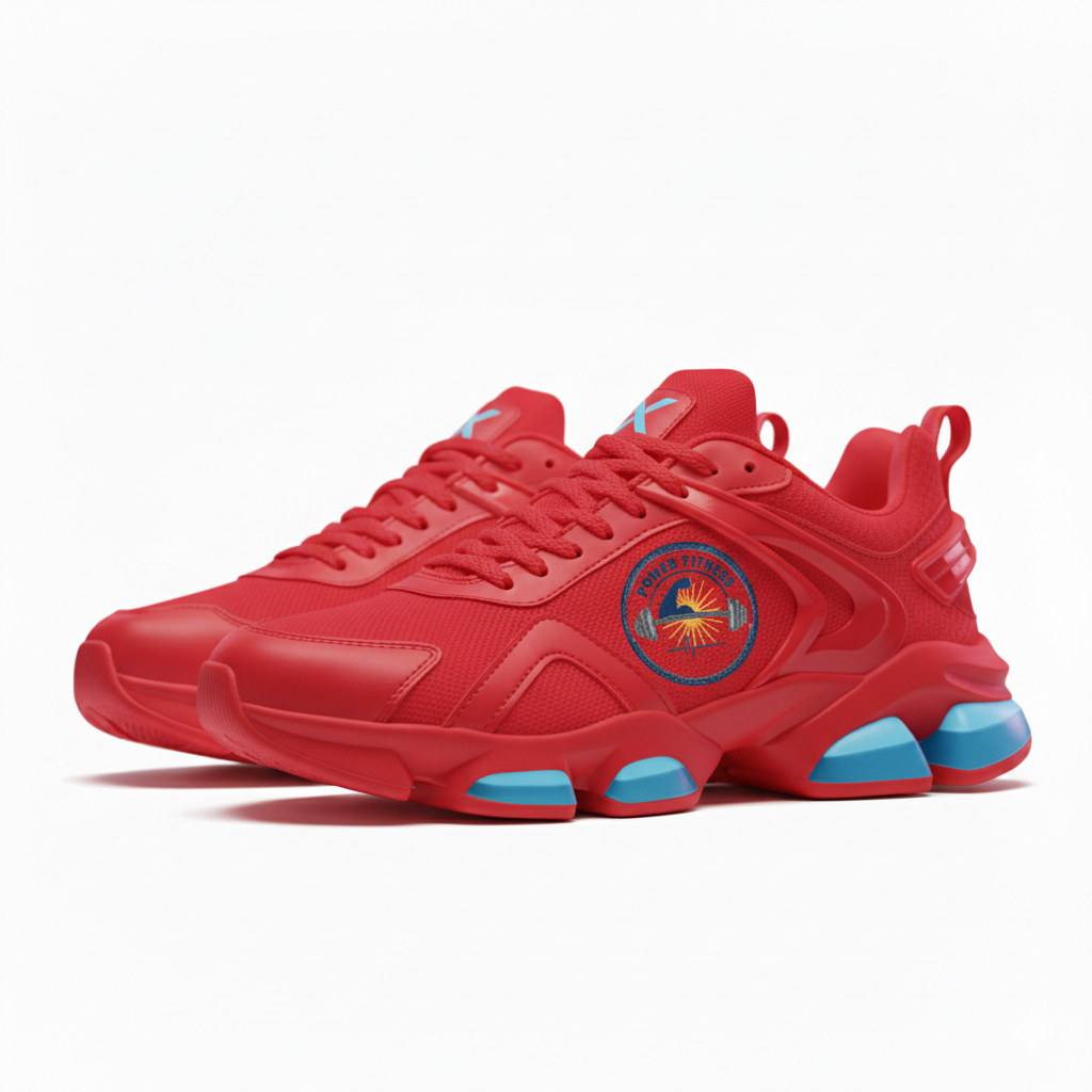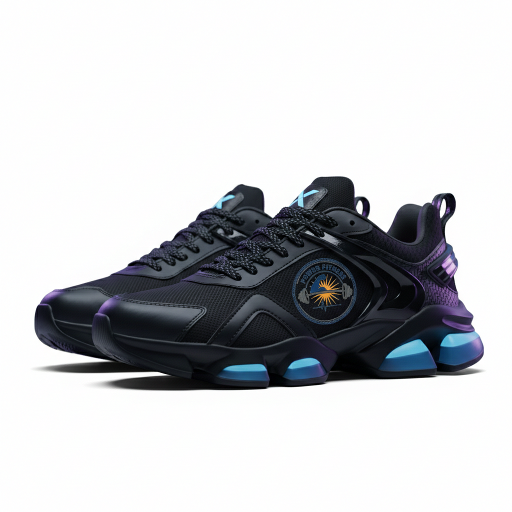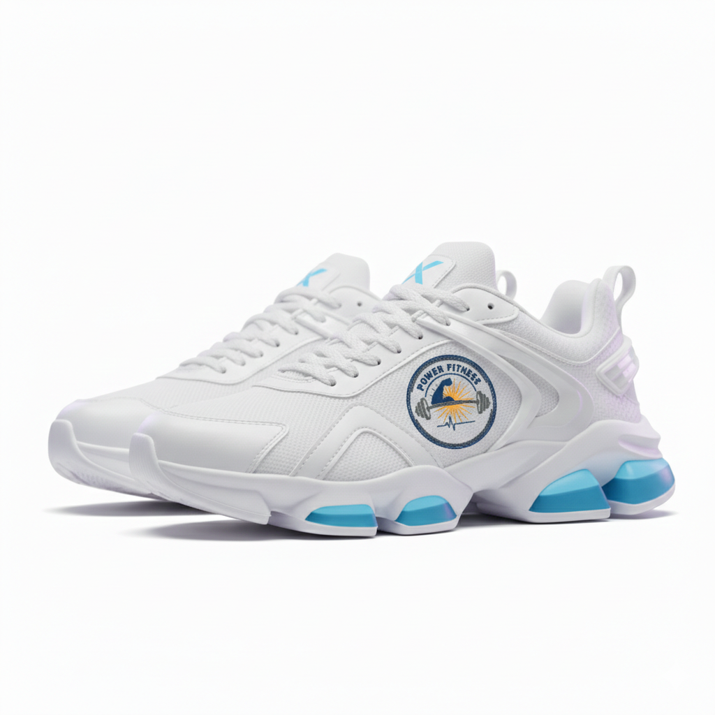 โลโก้ Power Fitness: ตำแหน่งด้านข้างรองเท้า แสดงถึงความแข็งแกร่งและความมุ่งมั่น